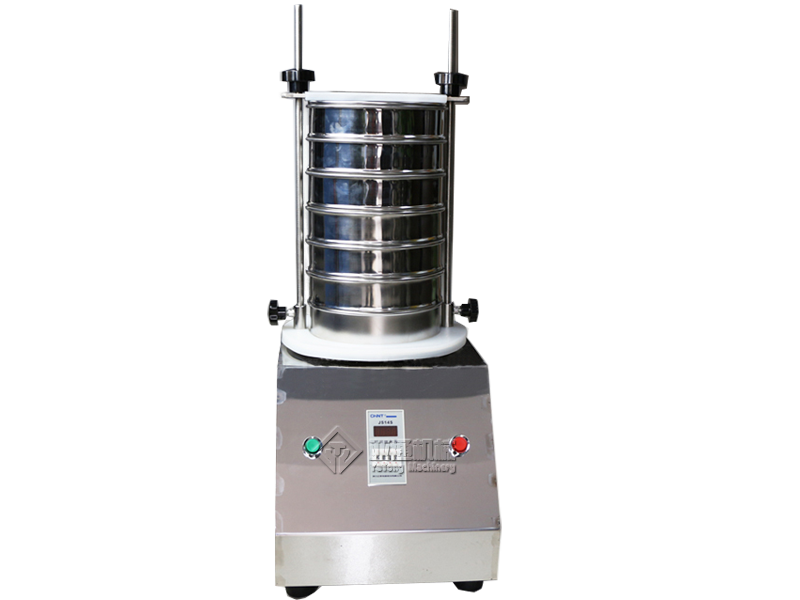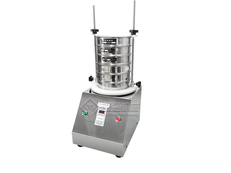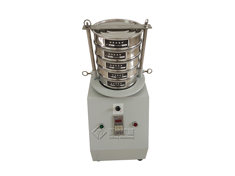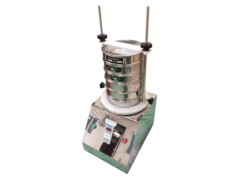 檢驗篩是以YZU立式振動電機作為整機振動源,通過振動電機帶動上部振動盤振動,再通過振動盤傳導至安放在振動盤上部圓形篩框,然后由需要檢測目數的篩框把小于篩網孔徑的物料顆粒篩分至下層篩框,如此層層篩選,使每層檢驗篩內只留相同粒度的物料而達到不同粒度的分離,使篩框中的物料能非常有效的起到分級篩分目的。
