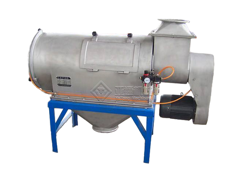 臥式氣流篩由進料口、驅動電機、螺旋輸送系統、除塵口、網架、主軸、風輪、風輪葉片、細出料口、粗出料口等組成。